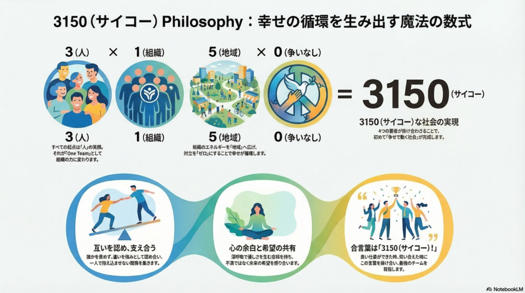 3(人)× 1(組織)× 5(地域)× 0(争いなし) = 幸せが循環する社会